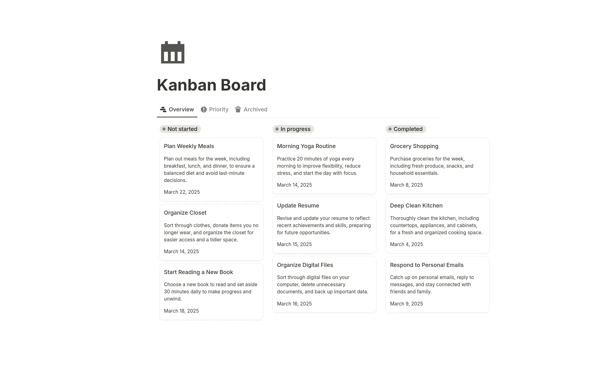 It is divided into three main sections: Not Started, In Progress, and Completed, allowing you to visualize your progress at a glance.